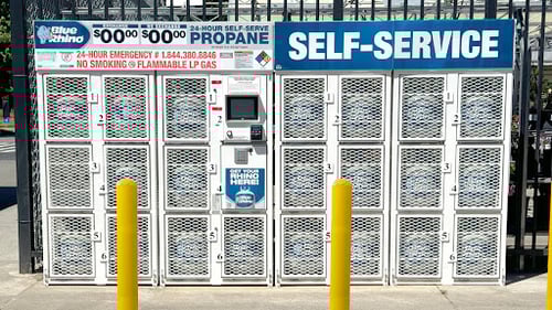 Need propane for your grill or propane appliance? Try Blue Rhino's 24/7 self-service vending machines at Walmart. Blue Rhino makes it easy for you to exchange your propane tank or pick up a spare. Our vending kiosks accept major credit cards or a code purchased in-store. It's the quick, convenient, 24/7 way to buy propane!