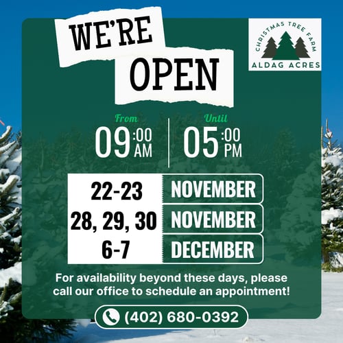 At Aldag Acres, we offer a variety of premium trees to suit your holiday needs. Whether you prefer the traditional scent of a Scotch Pine or the soft needles of a Concolor Fir, you’ll find the perfect tree to fill your home with festive cheer. Open Dates are from November 29 & 30 from 9:00 AM to 5:00 PM, December 1, 7 & 8 from 9:00 AM - 5:00 PM and anytime by appointment. Call us now!