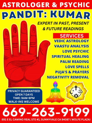 Astrology, Fortune Telling and Psychic Reading Services from Astro Kumar. Love Spells, Relationship Issues, Marriage Issues, Children Issues, Job and Career Issues, Business Problems, Vaastu analysis, Get Love Back, Negative Energy Removal and more. Call Now for Appointments. Located in Sunnyvale, CA.