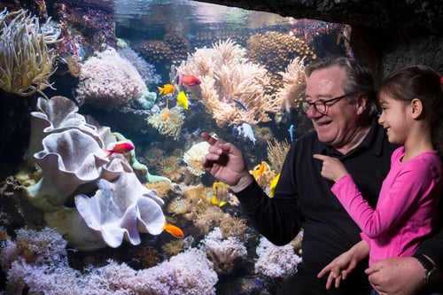Visitors can explore underwater worlds including the city's only underwater ocean tunnel with sharks, stingrays, tropical fish, interactive rockpool, and over 10 exhibits featuring marine life like seahorses and sea turtles.