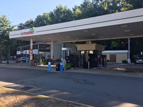 Cheap gas, self service. Good location on Merrimon.