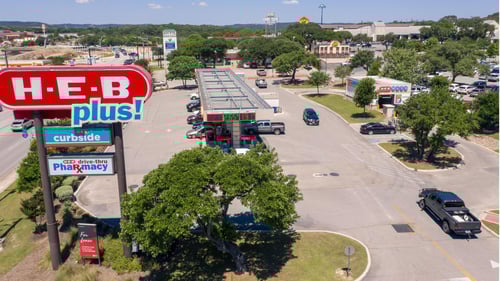 Nearby shopping options include HEB grocery store, HEB Wireless electronics and mobile phone store, Corner Store convenience store, Shell gas and convenience store, Redbox rental kiosk, and Chic Jewelry store.