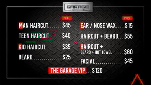The Garage Barbershop offers haircuts for men, women, and kids, beard trims, eyebrow waxing, undercuts, custom cuts, classic cuts, hot towel treatments, and facials.