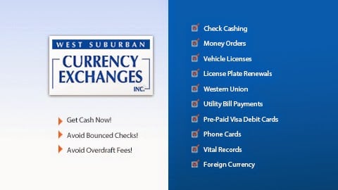 West Suburban Currency Exchanges offers check cashing, money orders, and acts as an agent for the Illinois Secretary of State to handle title, registration, and license plate renewal services.