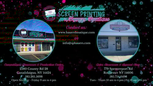 Screen Printing by Bauers is a woman-owned family business located in Canandaigua and Rochester NY providing screen printing, embroidery, and a variety of promotional items. With locations across the Rochester region in Spencerport and Canandaigua, we have capabilities of printing and fulfilling custom orders of all types and sizes. Are you looking for a reliable local option for your apparel? Contact us today to get started!