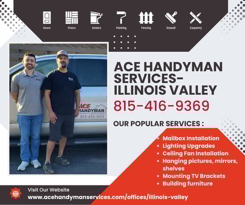 Ace Handyman Services Illinois Valley offers a wide variety of home services such as drywall repair, general carpentry, flooring installation, painting, deck repairs, concrete repairs, concrete flat work, shed install, shed construction, swing/play set assemble, and much more! Our team of skilled craftsman can tackle almost any job no matter the size. As members of the community they serve they put pride into each job they complete. Providing quality work to the Morris, Ottawa and Yorkville areas!