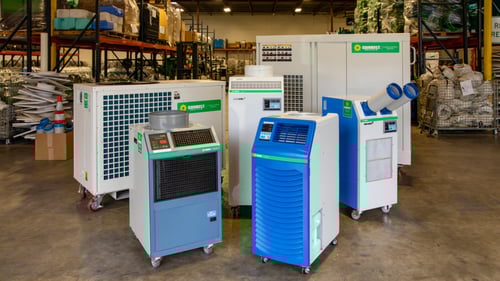 Sunbelt Rentals Climate Control offers a wide range of equipment including portable and industrial air conditioners, evaporative coolers, air handlers, chillers, fans, blowers, dehumidifiers, air scrubbers, negative air machines, hydroxyl and ozone machines, and various types of heaters such as direct-fired, indirect-fired, steam, hydronic/ground, and electric heaters.