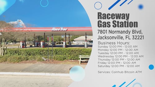 This Coinhub Bitcoin ATM is located inside Raceway Gas Station in Jacksonville, FL where you can buy Bitcoin (BTC), Ethereum (ETH), Tether (USDT), and USDC with cash. No prior account is needed. Enjoy $50K Daily Purchase Limits ($20 min). 24/7 Assistance & Customer Support available making it perfect for first-time users. For more locations, visit our website to find a Crypto ATM near you.