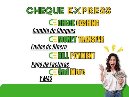 Cheque Express en Dalton, GA, somos tu aliado de confianza para servicios financieros seguros y rápidos. Ya sea que necesites cambiar un cheque, enviar dinero, pago de facturas o comprar giros postales, estamos aquí para hacer que la gestión de tus finanzas sea rápida y sencilla. Con orgullo servimos a nuestra comunidad local, comprometidos a brindarte un servicio amable y soluciones adaptadas a tus necesidades.