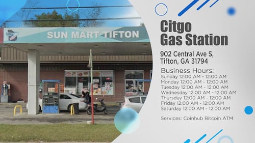 This Coinhub Bitcoin ATM is located inside Citgo Gas Station in Tifton, GA where you can buy Bitcoin (BTC), Ethereum (ETH), Tether (USDT), and USDC with cash. No prior account is needed. Enjoy $50K Daily Purchase Limits ($20 min). 24/7 Assistance & Customer Support available making it perfect for first-time users. For more locations, visit our website to find a Crypto ATM near you.