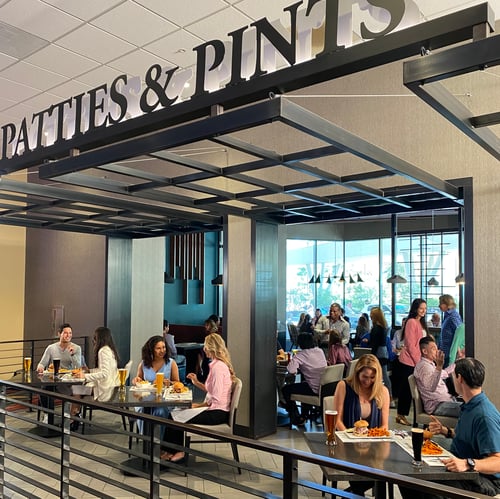 Patties & Pints serves handcrafted burgers made from their signature all-beef blend and deep dish pizzas with gourmet toppings, along with a variety of draft beers, wines, cocktails, martinis, and shakes.