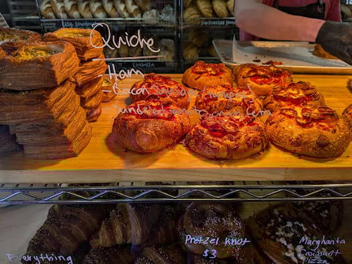 Cheerful neighborhood bakeshop serving artisanal breads, pastries, pizza & cakes in a rustic space.