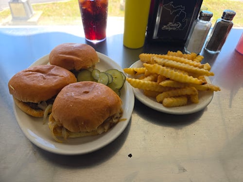 Old-timey counter-serve hamburger stand dishing up breakfasts, burgers & fries.