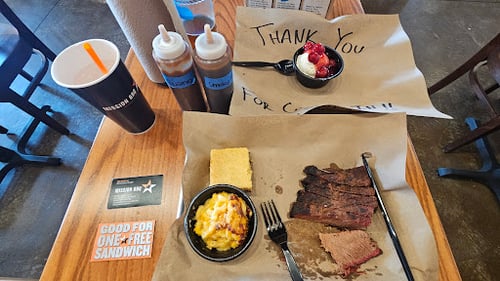 Casual chain featuring BBQ & classic sides, plus memorabilia honoring soldiers & first responders.