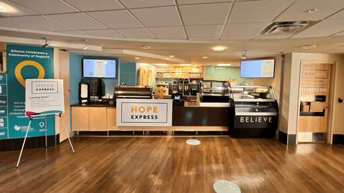 Hope Express is a coffee stand and quick eatery located on the skyway level within Gillette Children's Specialty Care. Hope Express is owned and operated by Hope Breakfast Bar and Purpose Restaurants.