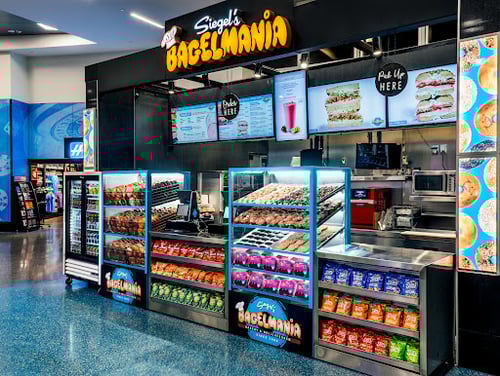Located on Level 2 near gate A10 in McCarran International Airport. Bagelmania bakery & delicatessen offers classic bagel sandwiches, deli sandwiches, pastries & cookies. Favorites include The Old School: Pick your bagel, bacon, egg & cheese or the Rueben Siegel: pastrami, corned beef or turkey, sauerkraut, swiss & russian dressing on marbled rye.
