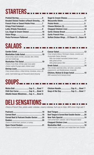 Signature dishes include authentic piled-high sandwiches, traditional Matzo Ball soup, Bagels and Lox, the Manhattan Cobb Salad, and their famous house-made New York Cheesecake.
