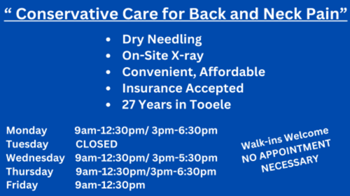 our chiropractic office specializes in effective, natural pain relief for back pain, neck pain, and joint discomfort. We provide personalized care to help you move better, feel stronger, and live pain-free. Our expert team uses advanced techniques to restore mobility and improve overall wellness. Serving Tooele and surrounding areas, we’re committed to your health and well-being.