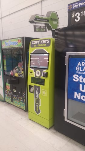 Minute Key uses automated self-serve kiosks located within Walmart stores that provide affordable, secure, and precise key duplication services for various key types.