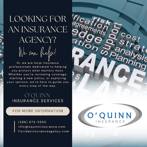 At O’Quinn Insurance Services, our customers are family. We are dedicated to protecting the hard work and families of our community, and with over 50 years of experience in Volusia and Flagler counties. We are local first and foremost and are dedicated to our family of customers. As a top-rated insurance agency in the Volusia and Flagler area, we pride ourselves on providing the best coverage for home insurance, auto insurance, motorcycle insurance, boat insurance, and flood insurance needs. We don't use automated phone lines, ensuring personalized service. We shop consumer policies with over 60 carriers in Florida, including all A-rated carriers, and our team consists entirely of local staff. Call us today for a free quote!