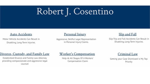 Robert J. Cosentino specializes in personal injury claims including auto and motorcycle accidents, slip and fall accidents, dog bites, property damage, workers' compensation claims, family law such as divorce and child custody, as well as criminal defense cases.