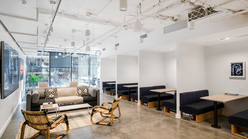 WeWork offers shared office space including an expansive lounge, comfortable conference rooms, and private offices designed to foster connection.