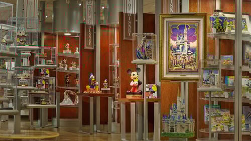 The Art of Disney is a shop featuring dazzling works of art including framed prints, figurines, and souvenir postcards, with occasional appearances by renowned Disney artists to sign their pieces.