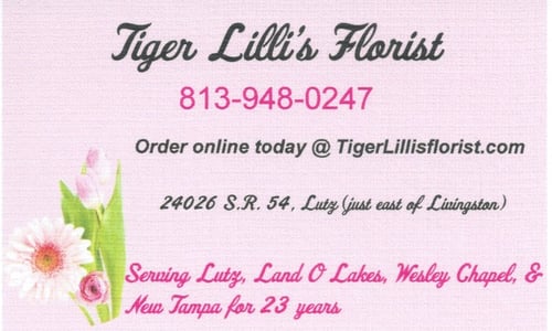 What is the address of Tiger Lilli's Florist? Tiger Lilli's Florist is located at 24026 State Road 54, Lutz, FL 33559, USA.