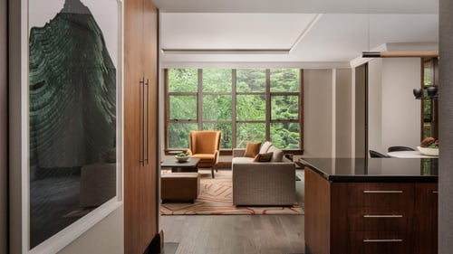 The resort features spacious guest rooms, suites, and private residences, many with stunning mountain or forest views. Each accommodation is designed with sophisticated wooden interiors, gas fireplaces, and separate sitting areas to provide a cozy and luxurious atmosphere.