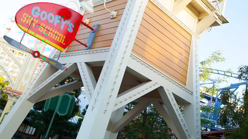 Goofy's Sky School is a coaster-style attraction where you can soar high and learn to fly the Goofy way, located in Disney California Adventure Park.