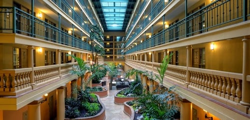 The entrance and main sitting areas are spacious and welcoming. The rooms are the standard comfortable Embassy rooms, however the cleanliness is not up to Embassy standards. Stayed in room 207 which had dusty lamps and cabinets, a bathroom sink with a slow drain and a sink with poor water pressure, stained upholstery on the furniture in the living room. I wiped everything down with clorox wipes, even the dusty lamps. It's evident this location doesn't have enough staff as rooms were still being cleaned after the 4pm "guaranteed" check in time and many still weren't ready. The on site restaurant only had one server who was overwhelmed with 8 tables. I felt bad for him since he had no help.