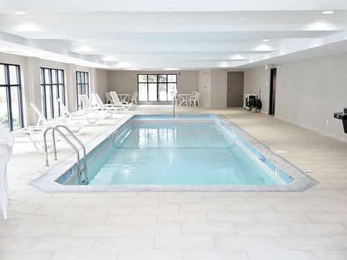 Yes, there is an indoor heated pool and a free fitness center with equipment including elliptical machines, free weights, and treadmills.