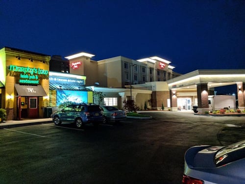 They spent some money on the furnishings, nice tile bathrooms. But missed it in some details. A stained bed cover and towel. Toilet seat wouldn't stay up on its own. Toilet not straight on the wall, very noticeably...room 404 if someone wants to look into it. Also toilet paper holder mounted way off level as well. The USB charging port bedside did not work with either of the devices I needed to charge overnight. Breakfast was mediocre by Hampton Inn standards, but serviceable. Not a bad stay, but I choose "Hilton" places to avoid these things. I'll try somewhere else next time.