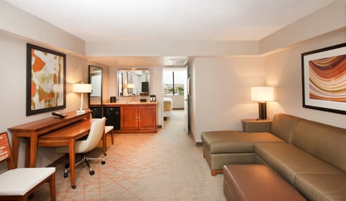Kick off your shoes and feel at home in a spacious two-room suite. The living room has a sofa bed, HDTV and work table, plus a kitchenette with microwave, mini-refrigerator, wet bar and coffeemaker. The private bedroom has an additional HDTV.